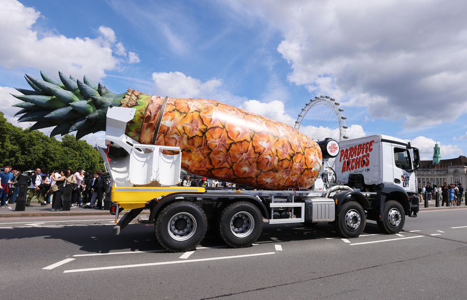 The unconventional partnership called for a debut to match. Time to roll out a giant 30ft ice-cream churning pineapple on wheels!